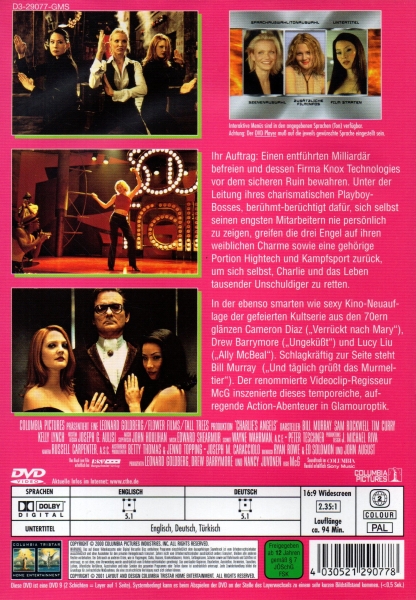 In der ebenso smarten wie sexy Kino-Neuauflage der gefeierten Kultserie aus den 70ern glänzen Cameron Diaz (,,Verrückt nach Mary"), Drew Barrymore („Ungeküẞt“) und Lucy Liu (,,Ally McBeal"). Schlagkräftig zur Seite steht Bill Murray (Und täglich grüßt das Murmeltier"). Der renommierte Videoclip-Regisseur MCG inszenierte dieses temporeiche, auf- regende Action-Abenteuer in Glamouroptik.