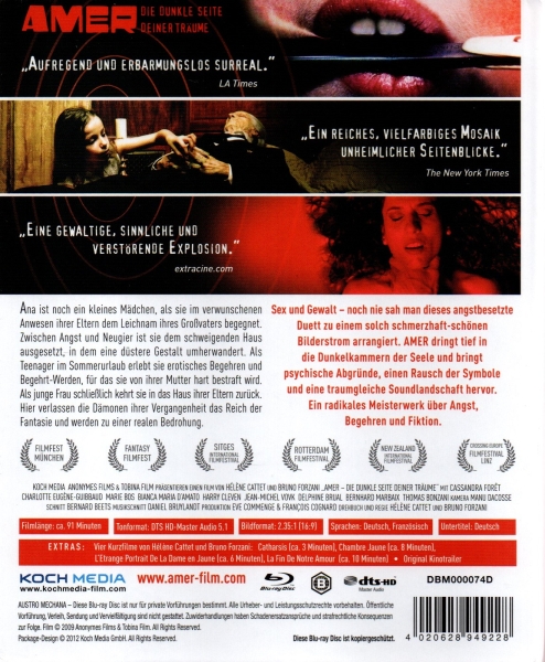 Sex und Gewalt - noch nie sah man dieses angstbesetzte Duett zu einem solch schmerzhaft-schönen Bilderstrom arrangiert. AMER dringt tief in die Dunkelkammern der Seele und bringt psychische Abgründe, einen Rausch der Symbole und eine traumgleiche Soundlandschaft hervor. Ein radikales Meisterwerk über Angst, Begehren und Fiktion.