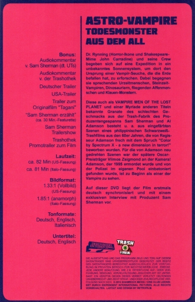 Dr. Rynning (Horror-Ikone und Shakespeare-Mime John Carradine) und seine Crew begeben sich auf eine Expedition in ein unbekanntes Sonnensystem, um dort den Ursprung einer Vampir-Seuche, die die Erde befallen hat, zu erforschen. Dabei begegnen sie sprechenden Urzeitmenschen, SteinzeitVampiren, Dinosauriern, fliegenden Affenmenschen und Klauen-Monstern. Diese auch als VAMPIRE MEN OF THE LOST PLANET und einer Myriade anderen Titeln bekannte Granate des schlechten Geschmacks aus der Trash-Fabrik des Produzentengespanns Sam Sherman und Al Adamson besteht u. a. aus eingefärbten Szenen eines philippinischen SchwarzweißTrashfilms aus den 60er Jahren, die von Regisseur Adamson frech mit dem Spruch "Color by Spectrum X - a new dimension in terror!" beworben wurden. Für die von Adamson neu gedrehten Szenen war der spätere OscarPreisträger Vilmos Zsigmond an der Kamera! Adamson, der 1995 ermordet wurde und von der Polizei im eigenen Pool einbetoniert gefunden wurde, ist zu Beginn als einer der Vampire zu sehen.