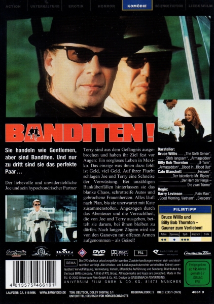 "Banditen" ist ein unterhaltsamer Film mit einer originellen Handlung und starken schauspielerischen Leistungen von Bruce Willis, Billy Bob Thornton und Cate Blanchett. Die DVD enthält neben dem Hauptfilm auch Bonusmaterial wie Interviews mit den Schauspielern und Regisseuren sowie Hintergrundinformationen zur Produktion des Films.