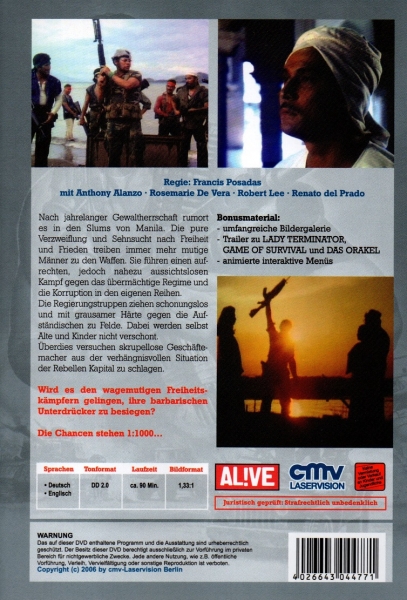 Nach jahrelanger Gewaltherrschaft rumort es in den Slums von Manila. Die pure Verzweiflung und Sehnsucht nach Freiheit und Frieden treiben immer mehr mutige Männer zu den Waffen. Sie führen einen aufrechten, jedoch nahezu aussichtslosen Kampf gegen das übermächtige Regime und die Korruption in den eigenen Reihen. Die Regierungstruppen ziehen schonungslos und mit grausamer Härte gegen die Aufständischen zu Felde. Dabei werden selbst Alte und Kinder nicht verschont. Überdies versuchen skrupellose Geschäftemacher aus der verhängnisvollen Situation der Rebellen Kapital zu schlagen. Wird es den wagemutigen Freiheitskämpfern gelingen, ihre barbarischen Unterdrücker zu besiegen? Die Chancen stehen 1:1000...