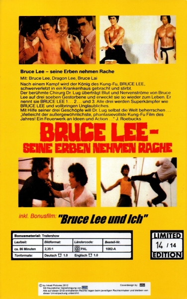 Bruce Lee - seine Erben nehmen Rache Mit: Bruce Lee, Dragon Lee, Bruce Lai Nach einem Kampf wird der König des Kung-Fu, BRUCE LEE, schwerverletzt in ein Krankenhaus gebracht und stirbt. Der berühmte Chirurg Dr. Lug überträgt Blut und Nervenströme von Bruce Lee auf drei soeben Gestorbene und erweckt sie so wieder zum Leben. Er nennt sie BRUCE LEE 1...2... und 3. Alle drei werden Superkämpfer wie BRUCE LEE und vollbringen Unglaubliches. Mit Hilfe seiner drei Geschöpfe will Dr. Lug selbst die Welt beherrschen. ,,Vielleicht der außergewöhnlichste, phantasievollste Kung-Fu Film des Jahres! Ein Feuerwerk an Ideen und Action ..." J. Roebucks