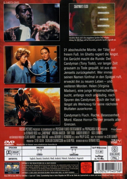 Die beiden Studentinnen Helen und Bernadette stoßen bei den Recherchen zu ihrer Doktorarbeit über moderne urbane Legenden, auf die grausige Geschichte vom „Candyman“: Ein Schwarzer, der sich vor hundert Jahren in eine weiße Frau verliebte, ihr ein Kind machte und von deren Vater dafür grausam und bestialisch hingerichtet wurde, in dem ihm unter anderem die Hand abgesägt wurde, er mit Honig übergossen- und danach von hunderten Bienen zu Tode gestochen wurde. Diese Legende soll angeblich wieder kehren und einen, mit einem furchtbaren Haken anstelle der Hand, aufschlitzen wenn man fünf Mal vor dem Spiegel seinen Namen ausspricht. Helen, die an den grausamen Mythos nicht glauben mag, begibt sich auf die Suche nach der unvorstellbaren Wahrheit...