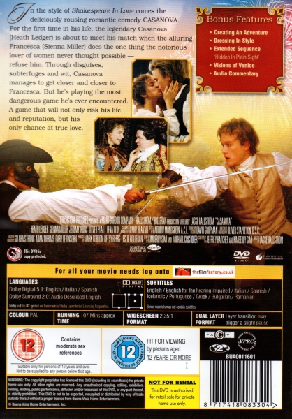 Lassen Sie sich verführen! Frauenschwarm Heath Ledger („Ritter aus Leidenschaft“) spielt den legendären Autor, Philosophen und Herzensbrecher Giacomo Casanova, dessen amouröse Verwicklungen jahrhundertelang zahllose Liebende inspiriert haben. Eine herrlich beschwingte Liebeskomödie von „Chocolat"-Regisseur Lasse Hallström.