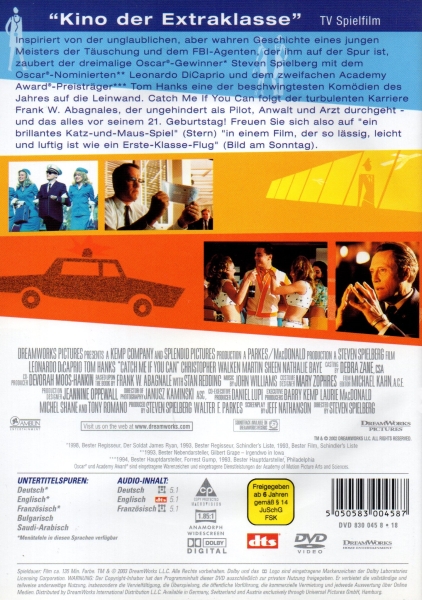 Inspiriert von der unglaublichen, aber wahren Geschichte eines jungen Meisters der Täuschung und dem FBI-Agenten, der ihm auf der Spur ist, zaubert der dreimalige Oscar®-Gewinner* Steven Spielberg mit dem Oscar®-Nominierten** Leonardo DiCaprio und dem zweifachen Academy Award®-Preisträger*** Tom Hanks eine der beschwingtesten Komödien des Jahres auf die Leinwand. Catch Me If You Can folgt der turbulenten Karriere Frank W. Abagnales, der ungehindert als Pilot, Anwalt und Arzt durchgeht - und das alles vor seinem 21. Geburtstag! Freuen Sie sich also auf "ein brillantes Katz-und-Maus-Spiel" (Stern) "in einem Film, der so lässig, leicht und luftig ist wie ein Erste-Klasse-Flug" (Bild am Sonntag)