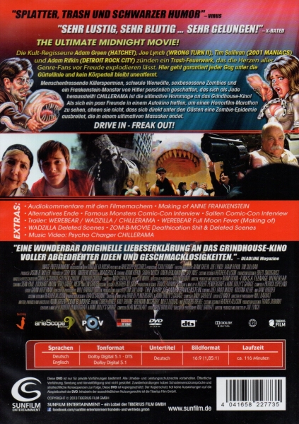 Menschenfressende Killerspermien, schwule Werwölfe, sexbesessene Zombies und ein Frankenstein-Monster von Hitler persönlich geschaffen, dass sich als Jude herausstellt! CHILLERAMA ist die ultimative Hommage an das Grindhouse-Kino! Als sich ein paar Freunde in einem Autokino treffen um einen Horrorfilm-Marathon zu sehen, ahnen sie nicht, dass sich direkt unter den Gästen eine Zombie-Epidemie ausbreitet, die in einem ultimativen Massaker endet.