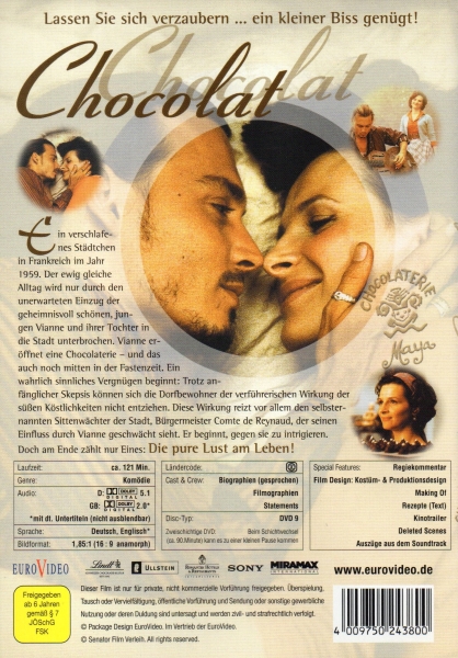 Die DVD enthält den kompletten Film in bester Bild- und Tonqualität sowie einige spannende Extras wie Interviews mit den Darstellern und Regisseuren, Hinter-den-Kulissen-Aufnahmen und vieles mehr. Tauchen Sie ein in die Welt von "Chocolat" und lassen Sie sich von der magischen Atmosphäre und den köstlichen Schokoladenkreationen verzaubern. Ein absolutes Muss für alle Liebhaber romantischer Filme und süßer Versuchungen!
