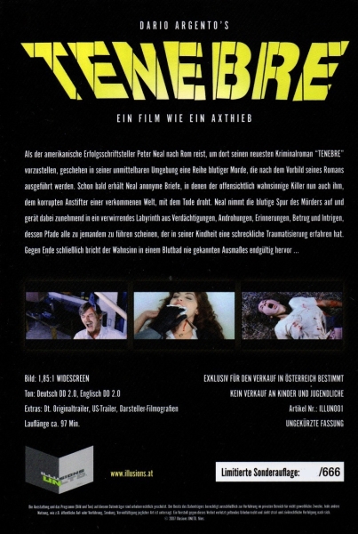 Als der amerikanische Erfolgsschriftsteller Peter Neal nach Rom reist, um dort seinen neuesten Kriminalroman “TENEBRE", vorzustellen, geschehen in seiner unmittelbaren Umgebung eine Reihe blutiger Morde, die nach dem Vorbild seines Romans ausgeführt werden. Schon bald erhält Neal anonyme Briefe, in denen der offensichtlich wahnsinnige Killer nun auch ihm, dem korrupten Anstifter einer verkommenen Welt, mit dem Tode droht. Neal nimmt die blutige Spur des Mörders auf und gerät dabei zunehmend in ein verwirrendes Labyrinth aus Verdächtigungen, Androhungen, Erinnerungen, Betrug und Intrigen, dessen Pfade alle zu jemandem zu führen scheinen, der in seiner Kindheit eine schreckliche Traumatisierung erfahren hat; Gegen Ende schließlich bricht der Wahnsinn in einem Blutbad nie gekannten Ausmaßes endgültig hervor ...
