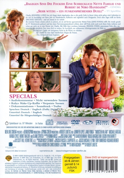 "Das Schwiegermonster" ist eine unterhaltsame Komödie mit Jennifer Lopez und Jane Fonda in den Hauptrollen. Die DVD erzählt die Geschichte von Charlotte, einer erfolgreichen Karrierefrau, die sich in den charmanten Kevin verliebt. Doch als sie seine Mutter Viola kennenlernt, stellt sich heraus, dass diese eine dominante und kontrollsüchtige Frau ist, die alles daran setzt, ihre Beziehung zu sabotieren. Ein turbulentes Aufeinandertreffen zwischen Schwiegermutter und Schwiegertochter beginnt, bei dem kein Auge trocken bleibt. Mit viel Witz und Charme sorgt "Das Schwiegermonster" für beste Unterhaltung und ist ein Muss für alle Fans von humorvollen Liebesgeschichten.
