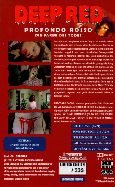 PROFONDO ROSSO - einer der ganz großen GIALLO-Klassiker von Kultregisseur DARIO ARGENTO. Ein faszinierender Alptraum voller unheimlicher Bilder und einzigartiger Atmosphäre. Mit DAVID HEMMINGS (BLOW UP, EQULIBRIUM) und DARIA NICOLDI (TERROR IN DER OPER) im restauerierten Director's Cut.