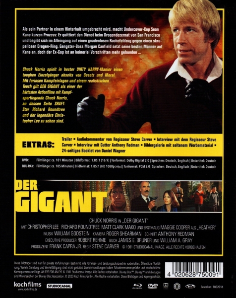Chuck Norris spielt in bester DIRTY HARRY-Manier einen toughen Einzelgänger abseits von Gesetz und Moral. Mit furiosen Kampfeinlagen und einem realistischen Touch gilt DER GIGANT als einer der härtesten Actionfilme mit Kampf- sportlegende Chuck Norris, an dessen Seite SHAFT- Star Richard Roundtree und der legendäre Chris- topher Lee zu sehen sind.