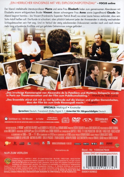 Der liberal intellektuelle Literaturprofessor Pierre und seine Frau Élisabeth laden zum gemeinsamen Abendessen mit Élisabeths enorm erfolgreichem Bruder Vincent, dessen schwangerer Frau Anna sowie Jugendfreund Claude. Der Abend beginnt harmlos - bis Vincent (Frankreichs Superstar Patrick Bruel) aus einer Laune heraus verkündet, dass sein Sohn Adolf heißen soll. Die Runde ist schockiert, aber plötzlich bekommt jeder der Anwesenden in ständig wechselnden Schlagabtauschen sein Fett weg. Und im Verlauf der stetig eskalierenden Diskussionen werden nach und nach immer mehr lang schwelende Konflikte und gut gehütete Geheimnisse zutage gefördert.