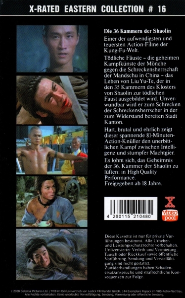 Die 36 Kammern der Shaolin Einer der aufwendigsten und teuersten Action-Filme der Kung-Fu-Welt. Tödliche Fäuste - die geheimen Kampfkünste der Mönche gegen die Schreckensherrschaft der Mandschu in China - das 'Leben von Liu Yu-Te, der in 'den 35 Kammern des Klosters von Shaolin zur tödlichen Faust ausgebildet wird. Unverwundbar wird er zum Schrecken der Schreckensherrscher in der zum Widerstand bereiten Stadt Kanton. Hart, brutal und ehrlich zeigt dieser spannende 81-Minuten Action-Knüller den unerbittlichen Kampf zwischen Intelligenz und stumpfer Machtgier.