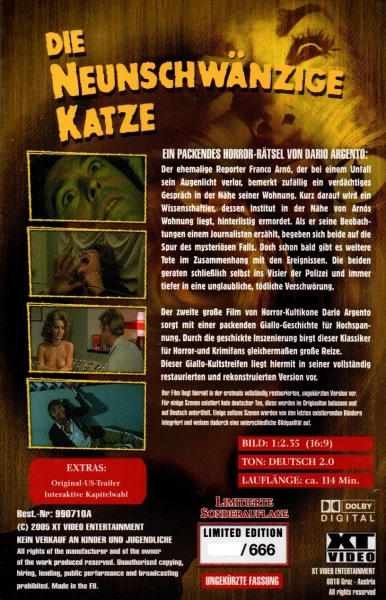 Der zweite große Film von Horror-Kultikone Dario Argento sorgt mit einer packenden Giallo-Geschichte für Hochspannung. Durch die geschickte Inszenierung birgt dieser Klassiker für Horror-und Krimifans gleichermaßen große Reize. Dieser Giallo-Kultstreifen liegt hiermit in seiner vollständig restaurierten und rekonstruierten Version vor.