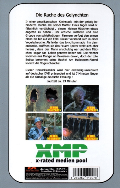 Die Rache des Gelynchten In einer amerikanischen Kleinstadt lebt der geistig behinderte Bubba bei seiner Mutter. Eines Tages wird er fälschlich verdächtigt, einem kleinen Mädchen etwas angetan zu haben. Der örtliche Postbote und eine Gruppe von schießwütigen Farmern verfogt den armen Mann bis hin auf ein Feld. Dieser versteckt sich in einer Vogelscheuche. Als leider das Lynchkommado ihn dann entdeckt, eröffnen sie das Feuer! Später stellt sich aber heraus, dass der Mann unschuldig war und dem Mädchen sogar das Leben gerettet haben soll. Die Männer kommen aus Mangel an Beweisen davon, doch der tote Bubba bekommt seine Rache! Am Halloween-Abend kommt die Vogelscheuche!