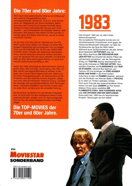Während teure Großproduktionen wie das James- Bond-Spektakel OCTOPUSSY oder der Star-Wars-Abschluss DIE RÜCKKEHR DER JEDI-RITTER wie erwartet die oberen Plätze der Jahrescharts einnahmen, war der überragende Erfolg von TOOTSIE ebenso überraschend wie das große Interesse an THE DAY AFTER. Dazu starteten Klassiker wie FLASHDANCE oder NUR 48 STUNDEN, während Bud Spencer und Terence Hill ihre Anhänger mit ZWEI AUSSER RAND UND BAND in die Kinos lockten. Actionfans wurden mit RAMBO beglückt, während sich die Rückkehr von Norman Bates in PSYCHO 2 vor allem an Thriller-Liebhaber richtete. Doch auch Freunde des anspruchsvolleren Kinos kamen mit dem Epos GANDHI auf ihre Kosten. Weitere Filme waren zweifellos DIE FLAMBIERTE FRAU, DAS FLIEGENDE AUGE oder EIN OFFIZIER UND EIN GENTLEMAN. Eines steht fest: 1983 war ein faszinierendes Kinojahr: Überzeugen sie sich selbst!