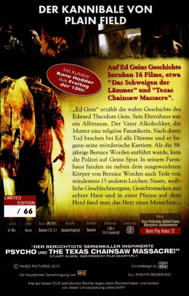 "Ed Gein" erzählt die wahre Geschichte des Edward Theodore Gein. Sein Elternhaus war ein Albtraum. Der Vater Alkoholiker, die Mutter eine religiöse Fanatikerin. Nach deren Tod brachen bei Ed alle Dämme und er begann seine mörderische Karriere. Als die 58-jährige Bernice Worden entführt wurde, kam die Polizei auf Geins Spur. In seinem Farmhaus fanden sie neben dem ausgeweideten Körper von Bernic Worden auch Teile von mindestens 15 anderen Leichen: Nasen, weibliche Geschlechtsorgane, Gesichtsmasken aus echter Haut und in einer Pfanne auf dem Herd fand man das Herz eines Menschen...