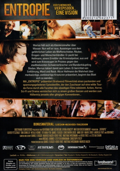 Mit „ENTROPIE" präsentiert Breitwand Filmvertrieb einen packenden und spannungsgeladenen Episodenfilm, der den Zuschauer auf eine wilde Tour- de-Force durch alle Facetten des abseitigen Films mitnimmt. Action, Horror, Sci-Fi und Drama vermischen sich zu einem großen Ganzen und werden zum Höllentrip jenseits aller gängigen Konventionen...