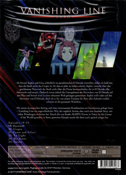 Mit einem dystopischen Setting und einer interessanten Kombination an Charakteren gelingt Garo - Vanishing Line ein ungewöhnlicher Mix, der zugleich Action, aber auch eine fesselnde Story mit vielen Wendungen zu bieten hat. Durch die von Studio MAPPA (Terror in Tokio, In this Corner of the World) grandios in Szene gesetzten Kämpfe macht die Serie auch optisch einiges her.