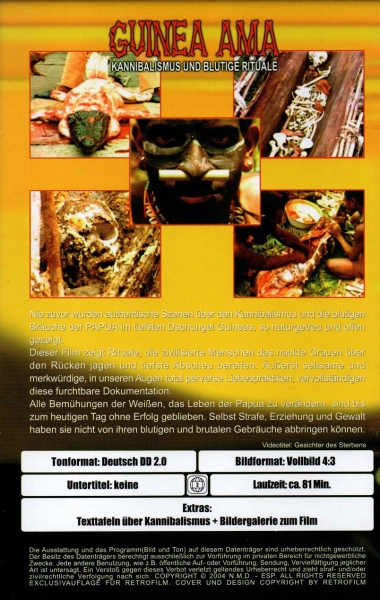 Nie zuvor wurden authentische Szenen über den Kannibalismus und die blutigen Bräuche der PAPUA im tiefsten Dschungel Guineas, so naturgetreu und offen gezeigt. Dieser Film zeigt Rituale, die zivilisierte Menschen das nackte Grauen über den Rücken jagen und tiefste Abscheu bereiten. Äußerst seltsame und merkwürdige, in unseren Augen total perverse Liebespraktiken, vervollständigen diese furchtbare Dokumentation. Alle Bemühungen der Weißen, das Leben der Papua zu verändern, sind bis zum heutigen Tag ohne Erfolg geblieben. Selbst Strafe, Erziehung und Gewalt haben sie nicht von ihren blutigen und brutalen Gebräuche abbringen können.