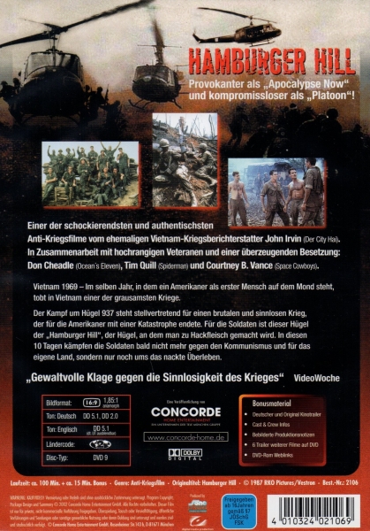 Vietnam 1969. Eine Gruppe von 14 "Fucking New Guys" kommt in diese mörderische Hölle, um an einem strategisch völlig unbedeutenden Hügel ihr Leben zu lassen. Der zehntägige Kampf um den Hügel 937 steht stellvertretend für einen brutalen und sinnlosen Krieg, der für Amerika mit einer Katastrophe endete. Für die Soldaten ist dieser Hügel, der "Hamburger Hill", der Hügel, an dem man zu Hackfleisch gemacht wird. Sie kämpfen bald nicht mehr gegen den Kommunismus und auch nicht für das eigene Land, sondern nur noch ums eigene nackte Überleben.