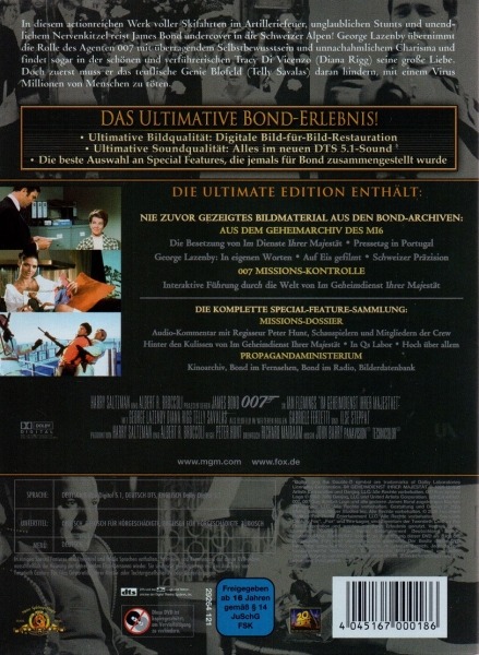 In diesem actionreichen Werk voller Skifahrten im Artilleriefeuer, unglaublichen Stunts und unendlichem Nervenkitzel reist James Bond undercover in die Schweizer Alpen! George Lazenby übernimmt die Rolle des Agenten 007 init überragendem Selbstbewusstsein und unnachahmlichem Charisma und findet sogar in der schönen und verführerischen Tracy Di Vicenzo (Diana Rigg seine große Liebe. Doch zuerst muss er das teuflische Genie Blofeld (Telly Savalas) daran hindern, mit einem Virus Millionen von Menschen zu töten.