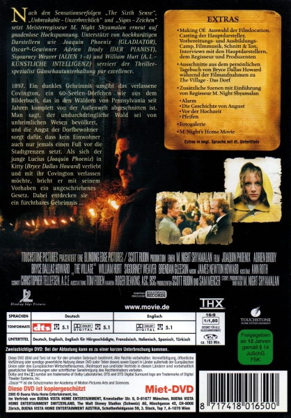 Der Film erforscht Themen wie Angst, Isolation, Liebe und die menschliche Natur. Er zeichnet sich durch seine düstere Atmosphäre, unerwartete Wendungen und eine starke Besetzung aus. "The Village - Das Dorf" ist ein fesselnder Thriller, der den Zuschauer bis zum Schluss in seinen Bann zieht.