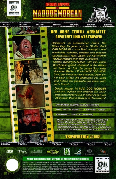 Goldrausch im australischen Busch. Das Glück liegt für jeden auf der Straße. Doch Dan Morgan - vom Pech verfolgt - wird unschuldig verhaftet, gefoltert und grausam gebrandmarkt. Nach Jahren der Haft entrinnt Morgan gebrochen dem Zuchthaus. Sinnlos niedergeschossen und von einem Buschmann gebeilt überzieht er die Wildnis mit Terror und Tod: die blutige Spur eines einsamen Wolfes - Er wird Mad Dog Morgan, der Herrscher der Savanne! Doch seiner Spur folgen die Bluthunde der Justiz und hetzen ihn gnadenlos ins letzte erbitterte Gefecht.