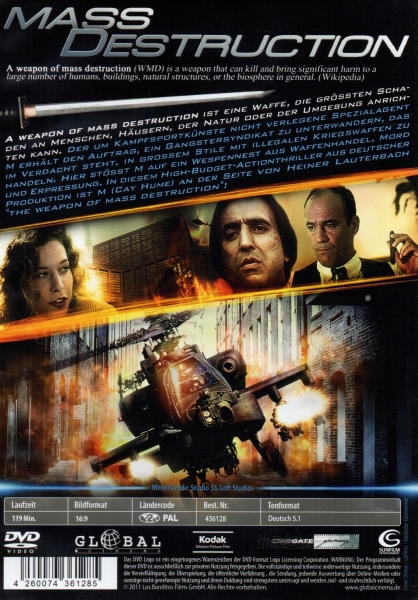 A WEAPON OF MASS DESTRUCTION IST EINE WAFFE, DIE GRÖSSTEN SCHADEN AN MENSCHEN, HÄUSERN, DER NATUR ODER DER UMGEBUNG ANRICHTEN KANN. DER UM KAMPFSPORTKÜNSTE NICHT VERLEGENE SPEZIALAGENT M ERHÄLT DEN AUFTRAG, EIN GANGSTERSYNDIKAT ZU UNTERWANDERN, DAS IM VERDACHT STEHT, IN GROSSEM STILE MIT ILLEGALEN KRIEGSWAFFEN ZU HANDELN. HIER STÖSST M AUF EIN WESPENNEST AUS WAFFENHANDEL, MORD UND ERPRESSUNG. IN DIESEM HIGH-BUDGET-ACTIONTHRILLER AUS DEUTSCHER PRODUKTION IST M (CAY HUME) AN DER SEITE VON HEINER LAUTERBACH "THE WEAPON OF MASS DESTRUCTION"!