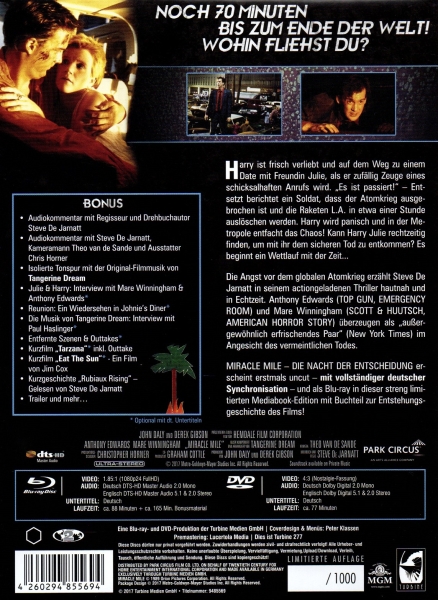 MIRACLE MILE DIE NACHT DER ENTSCHEIDUNG erscheint erstmals uncut - mit vollständiger deutscher Synchronisation - und als Blu-ray in dieser streng limitierten Mediabook-Edition mit Buchteil zur Entstehungsgeschichte des Films!