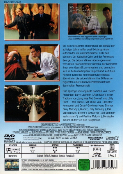 Vor dem turbulenten Hintergrund des Belfast der achtziger Jahre treffen zwei Existenzgründer aufeinander, die unterschiedlicher nicht sein könnten: Der Katholike Colm und der Protestant George. Die beiden Männer überzeugen einen verrückten Haarteilvertreter namens,der Skalpierer', ihnen sein Geschäft zu verkaufen, und versuchen sich im heiß umkämpften Toupetmarkt. Auf ihren Runden durch das konfliktgebeutelte Belfast überwinden die beiden Männer ihre Differenzen zugunsten einer lukrativen Partnerschaft und dauerhaften Freundschaft. Eine spritzige und originelle Komödie von Oscar®- Preisträger Barry Levinson (,,Rain Man") in der Tradition von, Lang lebe Ned Devine!' und,Billy Elliot - I Will Dance'. Mit Musik von „Gladiator"- Komponist und Oscar®-Gewinner Hans Zimmer. Barry McEvoy (,,Gloria"), Billy Connolly (,,Ihre Majestät Mrs. Brown"), Anna Friel („Ein Sommer- nachtstraum") und Pauline McLynn („Die Asche meiner Mutter") in den Hauptrollen.