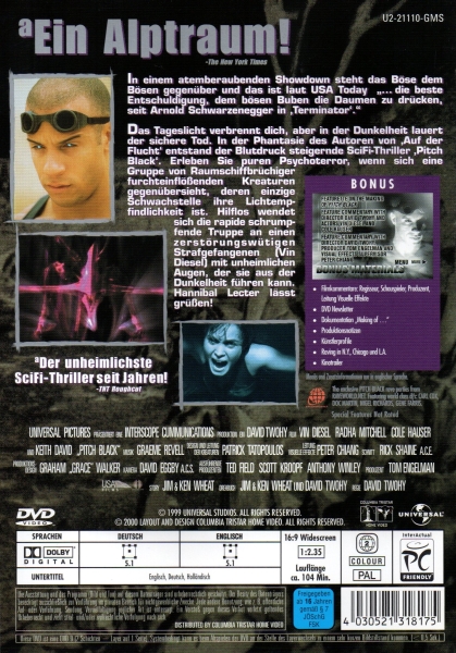 Das Tageslicht verbrennt dich, aber in der Dunkelheit lauert der sichere Tod. In der Phantasie des Autoren von‚Auf der Flucht entstand der Blutdruck steigernde SciFi-Thriller,Pitch Black'. Erleben Sie puren Psychoterror, wenn sich eine Gruppe von Raumschiffbrüchiger furchteinflößenden Kreaturen gegenübersieht, deren einzige Schwachstelle ihre Lichtempfindlichkeit ist. Hilflos wendet sich die rapide schrumpfende Truppe an einen zerstörungswütigen Strafgefangenen (Vin Diesel) mit unheimlichen Augen, der sie aus der Dunkelheit führen kann. Hannibal Lecter lässt grüßen!