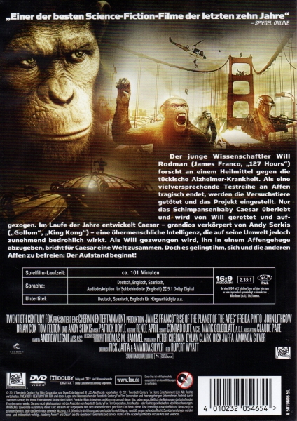 Der junge Wissenschaftler Will Rodman (James Franco, „,127 Hours") forscht an einem Heilmittel gegen die tückische Alzheimer-Krankheit. Als eine vielversprechende Testreihe an Affen tragisch endet, werden die Versuchstiere getötet und das Projekt eingestellt. Nur das Schimpansenbaby Caesar überlebt und wird von Will gerettet und aufgezogen. Im Laufe der Jahre entwickelt Caesar - grandios verkörpert von Andy Serkis (,,Gollum“, „King Kong“) – eine übermenschliche Intelligenz, die auf seine Umwelt jedoch zunehmend bedrohlich wirkt. Als Will gezwungen wird, ihn in einem Affengehege abzugeben, bricht für Caesar eine Welt zusammen. Doch es gelingt ihm, sich und die anderen Affen zu befreien: Der Aufstand beginnt!