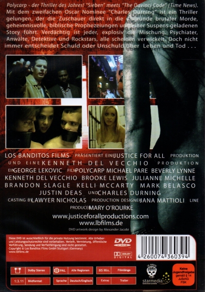 Polycarp - der Thriller des Jahres! "Sieben" meets "The Davinci Code" (Time News). Mit dem zweifachen Oscar Nominee "Charles Durning" ist ein Thriller gelungen, der die Zuschauer direkt in die Abgründe brutaler Morde, geheimnisvolle, biblische Prophezeiungen und einer Suspens geladenen Story führt. Verdächtig ist jeder, explosiv die Mischung. Psychiater, Anwälte, Detektive und Rockstars, alle scheinen verwickelt. Doch nicht immer entscheidet Schuld oder Unschuld über Leben und Tod...
