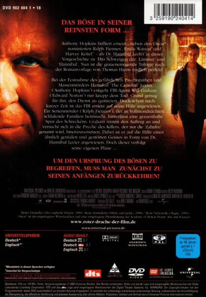 Anthony Hopkins brilliert erneut - neben den Oscar®-nominierten Ralph Fiennes, Emily Watson" und Harvey Keitel" - als Dr. Hannibal Lecter in dieser Vorgeschichte zu 'Das Schweigen der Lämmer' und 'Hannibal' Nun ist die grauenerregende Trilogie nach der Romanvorlage von Thomas Harris endlich perfekt!