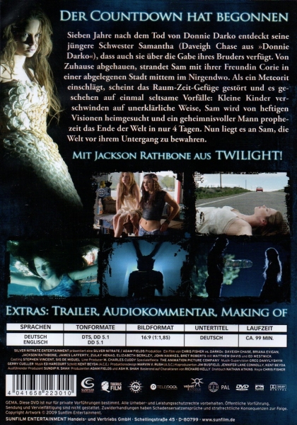 Sieben Jahre sind vergangen seit Donnie Darko tödlich verunglückt ist. Seine nun volljährige Schwester Sam entflieht zusammen mit ihrer Freundin Corey einem Elternhaus, das verlernt hat, seine Kinder zu lieben. Auf dem Weg nach Los Angeles bleibt ihr Wagen mitten im Nirgendwo liegen. Doch ein Meteoriteneinschlag scheint alles in dem ruhigen kleinen Städtchen zu verändern. Kleine Kinder verschwinden auf unerklärliche Weise, Sam wird von heftigen Visionen heimgesucht und ein Golfkriegsveteran prophezeit das Ende der Welt in nur 4 Tagen Tagen. Sie weiss, dass die besondere Gabe ihres Bruders auch in ihr steckt und nun liegt es nur an Sam die Welt vor ihrem Untergang zu bewahren...