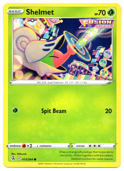 Die Nummerierung 013/264 gibt an, dass diese Karte die 13. von insgesamt 264 Karten in der Fusionsangriff-Erweiterung ist. Obwohl sie nicht holografisch ist, ist die Shelmet 013/264 Karte immer noch ein beliebtes Sammelobjekt für Fans des Pokemon Sammelkartenspiels aufgrund ihres charmanten Designs und ihrer Kampffähigkeiten.