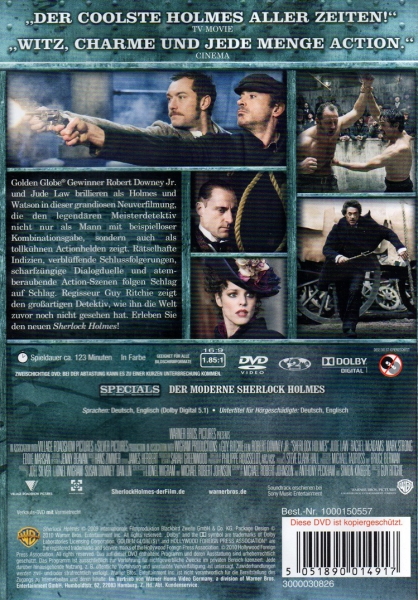 Golden Globe® Gewinner Robert Downey Jr. und Jude Law brillieren als Holmes und Watson in dieser grandiosen Neuverfilmung, die den legendären Meisterdetektiv nicht nur als Mann mit beispielloser Kombinationsgabe, sondern auch als tollkühnen Actionhelden zeigt. Rätselhafte Indizien, verblüffende Schlussfolgerungen, scharfzüngige Dialogduelle und atemberaubende Action-Szenen folgen Schlag auf Schlag. Regisseur Guy Ritchie zeigt den großartigen Detektiv, wie ihn die Welt zuvor noch nicht gesehen hat. Erleben Sie den neuen Sherlock Holmes!
