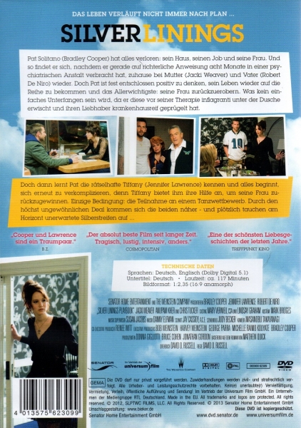 Pat Solatano (Bradley Cooper) hat alles verloren: sein Haus, seinen Job und seine Frau. Und so findet er sich, nachdem er gerade auf gerichtliche Anweisung acht Monate in einer psychiatrischen Anstalt verbracht hat, plötzlich zuhause bei Mutter (Jacki Weaver) und Vater (Robert de Niro) wieder. Pat ist fest entschlossen, positiv zu denken und damit sein Leben wieder auf die Reihe zu bekommen und seine Frau zurückzuerobern. Doch dann lernt Pat die rätselhafte Tiffany (Jennifer Lawrence) kennen und alles beginnt, sich erneut zu verkomplizieren, denn Tiffany bietet ihm ihre Hilfe bei der Rückeroberung seiner Frau an. Einzige Bedingung: ein Tanzkurs. Im Zuge ihres ungewöhnlichen Deals kommen sich die beiden auf überraschende Weise näher - und plötzlich tun sich am Horizont unerwartete Silberstreifen auf...