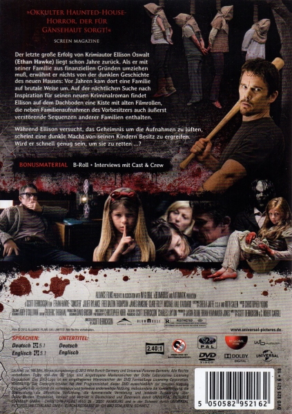 Der letzte große Erfolg von Krimiautor Ellison Oswalt (Ethan Hawke) liegt schon Jahre zurück. Als sie aus finanziellen Gründen umziehen müssen, erwähnt Ellison seiner Familie gegenüber nichts über die dunkle Geschichte des neuen Hauses: Vor Jahren kam dort eine Familie auf brutale Weise um und die jüngste Tochter verschwand spurlos. Der Autor lässt sich davon nicht beirren und hofft stattdessen, dort seinen neuen Kriminalroman beenden zu können. Auf der nächtlichen Suche nach Inspiration findet er auf dem Dachboden eine Kiste mit alten Filmrollen, die neben Familienaufnahmen des Vorbesitzers auch äußerst verstörende Sequenzen anderer Familien enthalten. Während Ellison versucht, das Geheimnis um die Aufnahmen zu lüften, scheint eine dunkle Macht von seinen Kindern Besitz zu ergreifen. Wird er schnell genug sein, um sie zu retten…?