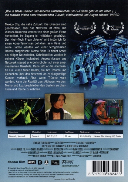 Mexico City, die nahe Zukunft. Die Grenzen sind geschlossen, aber das Netzwerk ist offen. Die Wasser-Reserven werden von einer großen Firma kontrolliert, ihr Zugang ist militärisch geschützt. Der High-Tech Freak "Memo" wird irrtümlich für einen Aqua-Terroristen gehalten, sein Haus und seine Familie werden von einer ferngelenkten Rakete ausgelöscht. Memo flieht. Er findet Arbeit als billiger Netzarbeiter, Schnittstellen werden in seinem Körper implantiert. Angeschlossen ans Netzwerk steuert er Arbeitsroboter auf einer amerikanischen Baustelle. Dann trifft er die Journalistin Luz, einen Sleep Dealer, die ihre Träume und Gedanken über das Netzwerk an zahlungswillige Kunden verkauft. Aber wenn Träume wahr werden, kann die Realität zum Albtraum werden. Memo und Luz beschließen das System zu überlisten und Rache zu nehmen.