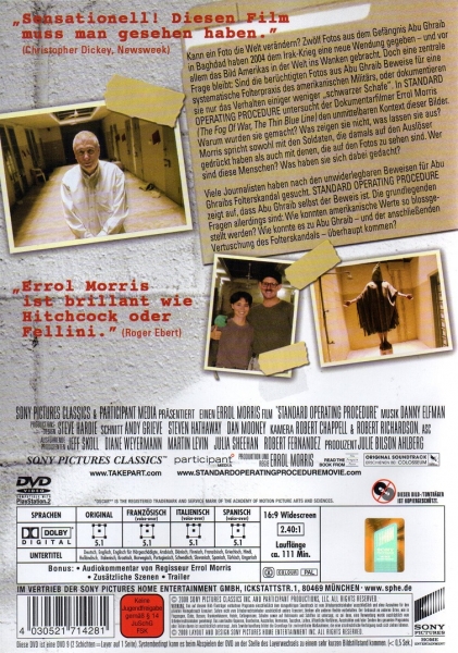 Kann ein Foto die Welt verändern? Zwölf Fotos aus dem Gefängnis Abu Ghraib in Baghdad haben 2004 dem Irak-Krieg eine neue Wendung gegeben und vor allem das Bild Amerikas in der Welt ins Wanken gebracht. Doch eine zentrale Frage bleibt: Sind die berüchtigten Fotos aus Abu Ghraib Beweise für eine systematische Folterpraxis des amerikanischen Militärs, oder dokumentieren sie nur das Verhalten einiger weniger schwarzer Schafe. In "Standard Operating Procedure" untersucht der Dokumentarfilmer Errol Morris den unmittelbaren Kontext dieser Bilder. Warum wurden sie gemacht? Was zeigen sie nicht, was lassen sie aus? Morris spricht sowohl mit den Soldaten, die damals auf den Auslöser gedrückt haben als auch mit denen, die auf den Fotos zu sehen sind. Wer sind diese Menschen? Was haben sie sich dabei gedacht? Viele Journalisten haben nach den unwiderlegbaren Beweisen für Abu Ghraibs Folterskandal gesucht. "Standard Operating Procedure" zeigt auf, dass Abu Ghraib selbst der Beweis ist. Die grundlegenden Fragen allerdings sind: Wie konnten amerikanische Werte so blossgestellt werden? Wie konnte es zu Abu Ghraib und der anschließenden Vertuschung des Folterskandals überhaupt kommen?