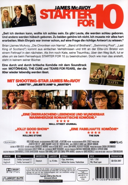 "Seit ich denken kann, wollte ich schlau sein. Es gibt Leute, die werden schlau geboren. Und andere werden hübsch geboren. Zu beiden gehöre ich nicht. Ich musste mir alles hart erarbeiten. Mein Ehrgeiz war immer schon, auf eine Frage die richtige Antwort zu wissen." Brian (James McAvoy, "Die Chroniken von Narnia", "Band of Brothers", "Swimming Pool", "Last King of Scotland", "Abbitte", "Geliebte Jane", "Wanted") kommt aus einfachen Verhältnissen und tritt an der Elite Uni Bristol von einem Fettnapf in den nächsten. Als ihm noch Kate, seine Traumfrau über den Weg läuft, tut er alles um sie beim Fernsehquiz STARTERS FOR 10 zu beeindrucken. Doch wie man das anstellt, steht in keinem seiner Bücher ... Eine durch und durch britische Komödie mit dem Soundtrack von MOTÖRHEAD, THE CURE und TEARS FOR FEARS, der die 80er wieder lebendig werden lässt.