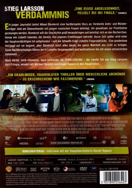Die DVD "Stieg Larsson Verdammnis" mit Noomi Rapace in der Hauptrolle ist die Verfilmung des zweiten Teils der erfolgreichen Millennium-Trilogie. Die packende Krimigeschichte handelt von der Journalistin Lisbeth Salander, die in einen Mordfall verwickelt wird und gemeinsam mit dem Journalisten Mikael Blomkvist die Hintergründe aufdecken muss. Die düstere Atmosphäre, die spannende Handlung und die brillante schauspielerische Leistung von Noomi Rapace machen diesen Film zu einem absoluten Must-See für Fans von skandinavischen Krimis. Tauchen Sie ein in die Welt von Stieg Larsson und erleben Sie ein fesselndes Filmabenteuer!