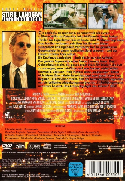 Das ist heute nicht McClanes Tag. Seine Frau hat ihn verlassen, sein Boß hat ihn vom Dienst suspendiert und irgendein Verrückter hat ihn gerade zum Gegenspieler in einem teuflischen Spiel erkoren - und der Einsatz ist New York selbst. Ein Kaufhaus ist explodiert, doch das ist nur der Auftakt. Der geniale Superverbrecher Simon droht, die ganze Stadt Stück für Stück in die Luft zu sprengen, wenn McClane und sein Partner wider Willen seine "explosiven" Rätsel nicht lösen. Eine mörderische Hetzjagd quer durch New York beginnt - bis McClane merkt, daß der Bombenterror eigentlich nur ein brillantes Ablenkungsmanöver ist...!