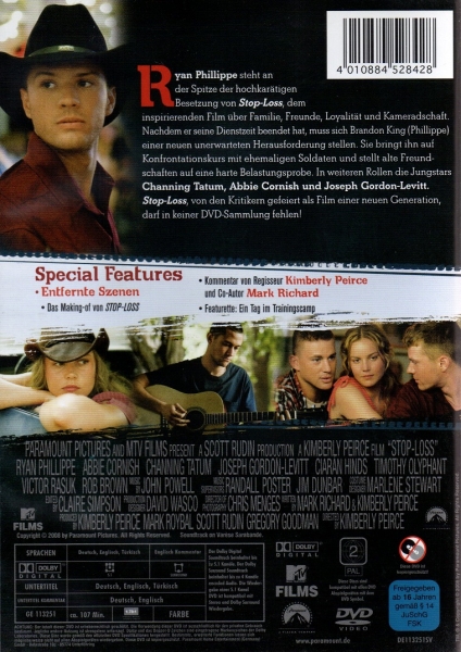 Ryan Phillippe steht an der Spitze der hochkarätigen Besetzung von Stop-Loss, dem inspirierenden Film über Familie, Freunde, Loyalität und Kameradschaft. Nachdem er seine Dienstzeit beendet hat, muss sich Brandon King (Phillippe) einer neuen unerwarteten Herausforderung stellen. Sie bringt ihn auf Konfrontationskurs mit ehemaligen Soldaten und stellt alte Freundschaften auf eine harte Belastungsprobe.
