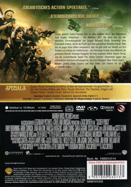 Dieser epische Action-Fantasy-Film ist die kreative Vision des Regisseurs Zack Snyder (Watchmen – Die Wächter, 300) – sie lässt uns mit der lebhaften Vorstellungskraft der jungen Babydoll (Emily Browning) eine Traumwelt erleben, die ihr die Flucht aus einer grausigen Realität erlaubt: Man hat sie gegen ihren Willen eingesperrt, aber sie gibt nicht auf, kämpft um ihre Freiheit und drängt vier Gefährtinnen – die freimütige Rocket (Jena Malone), die gerissene Blondie (Vanessa Hudgens), die treu ergebene Amber (Jamie Chung) und die zurückhaltende Sweet Pea (Abbie Cornish) –, gemeinsam gegen das schreckliche Schicksal aufzubegehren, das ihre Kidnapper Blue (Oscar Isaac), Madam Gorski (Carla Gugino) und High Roller (Jon Hamm) für sie vorgesehen haben.