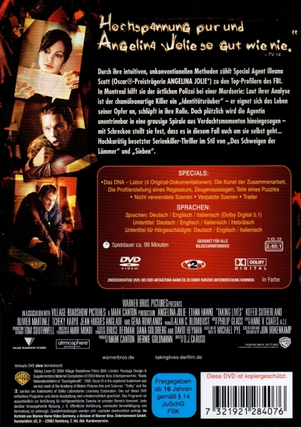 Die DVD bietet eine fesselnde Handlung, die mit Spannung und Nervenkitzel gefüllt ist. Angelina Jolies beeindruckende schauspielerische Leistung und die gut durchdachte Regie machen diesen Film zu einem Must-See für alle Fans von packenden Krimis. Mit einer Mischung aus Action, Mystery und Drama ist "Taking Lives - Für Dein Leben würde er töten" ein Film, den man immer wieder sehen möchte. Tauchen Sie ein in die düstere Welt des Serienmörders und erleben Sie einen atemberaubenden Thriller, der Sie bis zur letzten Minute fesseln wird.