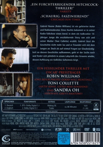 "The Night Listener" ist ein fesselnder Psychothriller, der den Zuschauer in eine Welt voller Geheimnisse und Lügen entführt. Der Film zeichnet sich durch seine düstere Atmosphäre und die brillanten schauspielerischen Leistungen aus. Robin Williams überzeugt in seiner Rolle als Gabriel Noone mit einer Mischung aus Verletzlichkeit und Entschlossenheit. Toni Collette brilliert als Donna Logand, Petes Mutter, die ebenfalls in den Verdacht gerät, Teil einer großen Täuschung zu sein.