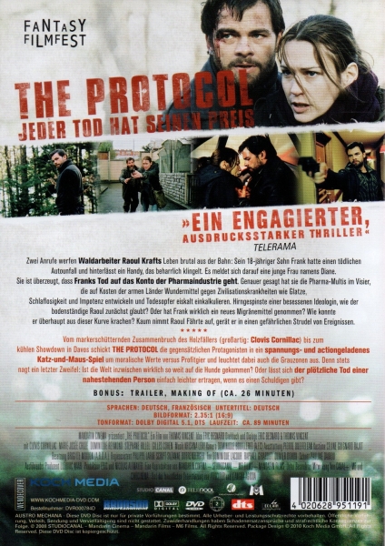Vom markerschütternden Zusammenbruch des Holzfällers (großartig: Clovis Cornillac) bis zum kühlen Showdown in Davos schickt THE PROTOCOL die gegensätzlichen Protagonisten in ein spannungs- und actiongeladenes Katz-und-Maus-Spiel um moralische Werte versus Profitgier und leuchtet dabei auch die Grauzonen aus. Denn stets nagt ein letzter Zweifel: Ist die Welt inzwischen wirklich so weit auf die Hunde gekommen? Oder lässt sich der plötzliche Tod einer nahestehenden Person einfach leichter ertragen, wenn es einen Schuldigen gibt?
